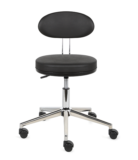 Seat & Backrest: Upholstered round cushion and ergonomic back support Base: Chrome five-star base with casters and gas lift Description: Comfortable adjustable stool with backrest support and casters for mobility